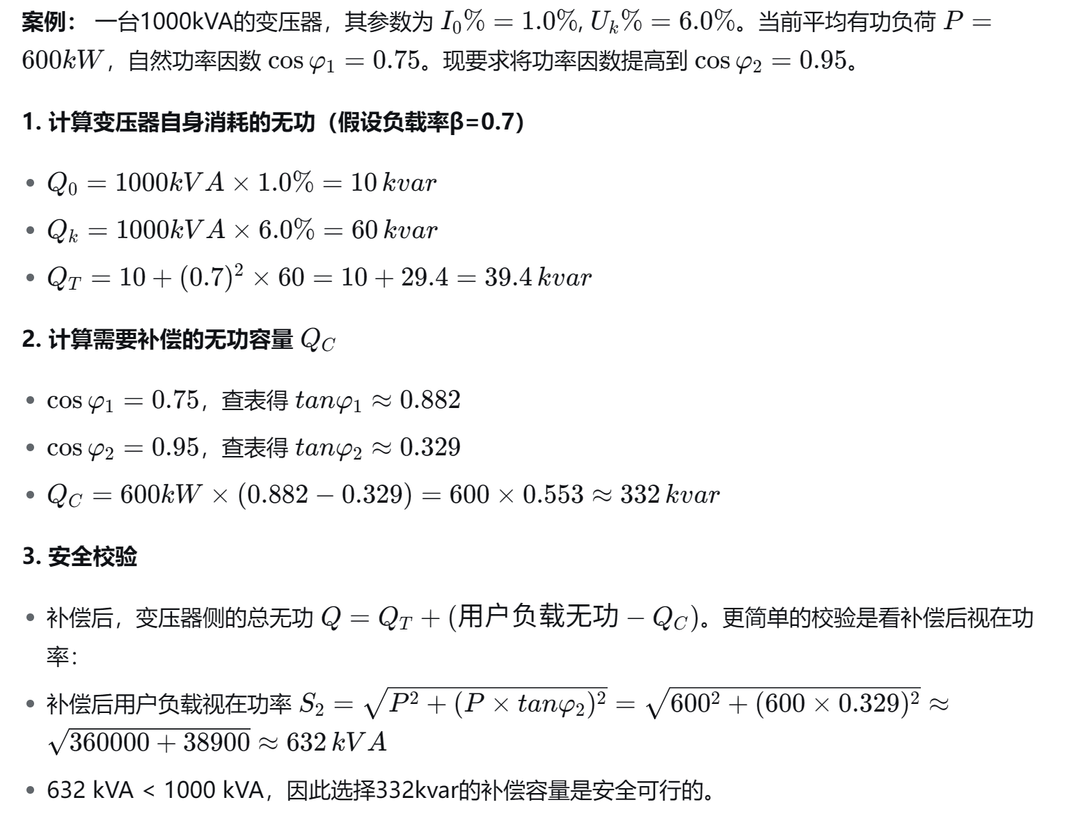这个计算的核心原则是:变压器的视在功率(kVA)是固定的,它是有功功率(kW)和无功功率(kvar)的矢量和。