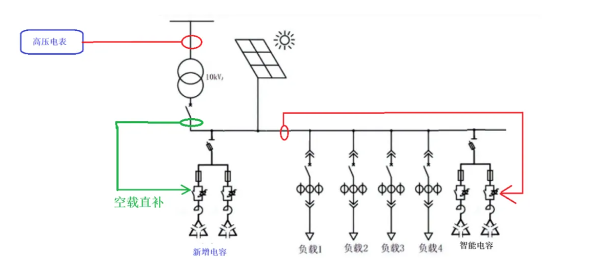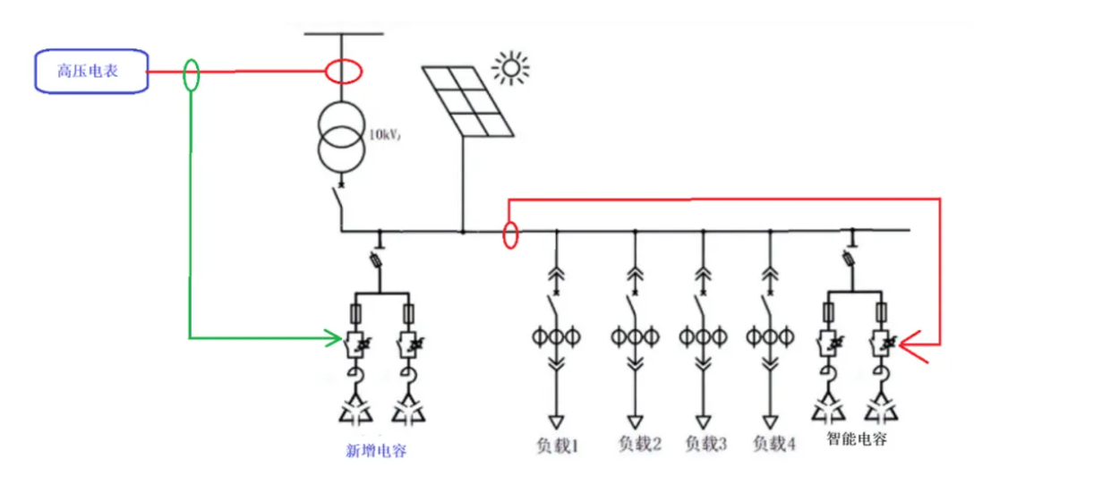 针对这个问题,需要额外新增一台专用无功补偿电容柜,安装位置有严格要求:直接装在变压器与光伏并网点之间,避免原有智能电容检测到新补偿柜无功而退出补偿。